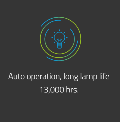 - Auto operation, long lamp life 13,000 hrs.